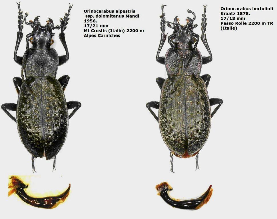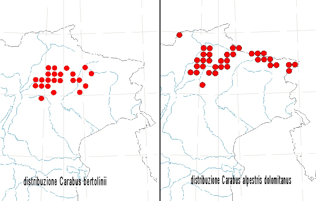 Volevo solo puntualizzare che la separazione fra queste due specie, in Trentino, non è così ben definita come riportato. Il Carabus bertolini, si raccoglie anche sui Monzoni (dx del torrente Avisio) come il Carabus alpestris dolomitanus si raccoglie anche nel gruppo di Cima d'Asta fino alla congiunzione con la catena del Lagorai presso passo Cinque croci (punto più a sud della sua distribuzione).