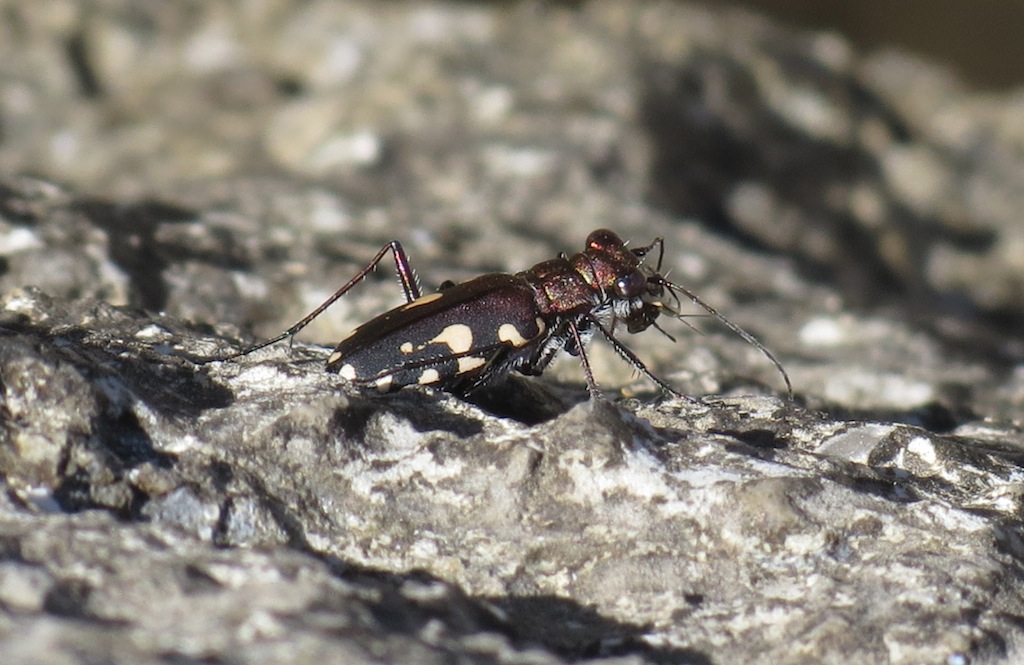 Al ritorno, mi racconta di un incontro particolare: rientrando da una nuotata, risalendo sugli scogli si trova di fronte una cicindela bruna con piccole macchiette bianche ...... :ocup