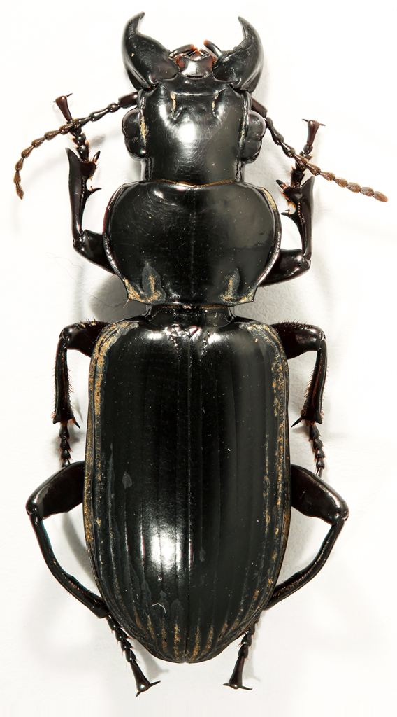 quasi 4 cm esemplare unico (credo) Basandomi su questo, direi stesso genere ma specie diversa. Come dicevo per l'altro, ha un aspetto simile a molti carabidi dei nostri climi, ma se guardate le dimensioni vi rendete conto che è più grosso di un Carabus. Mi hanno colpito anche gli occhi, che sembrano "doppi". Era terribilmente infangato: l'ho lavato ma il fango in parte è rimasto.