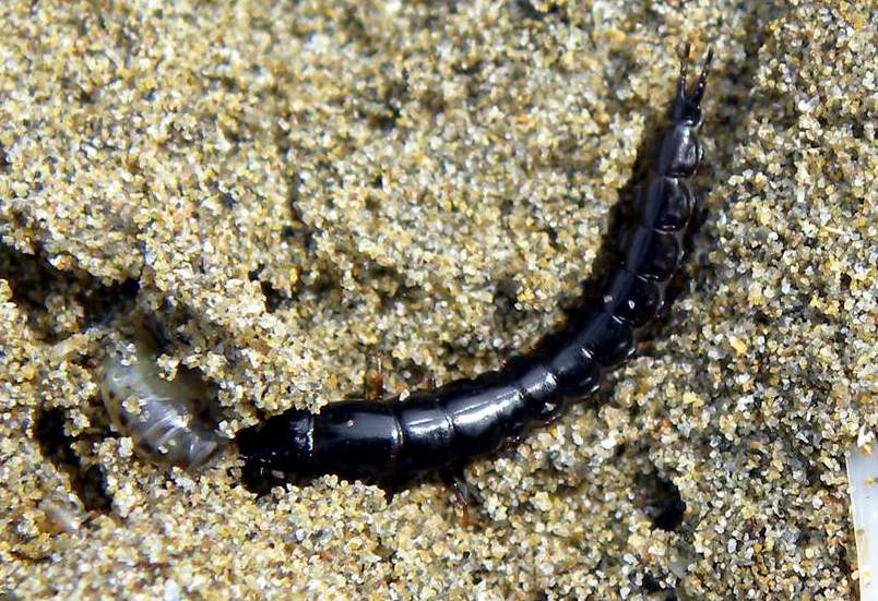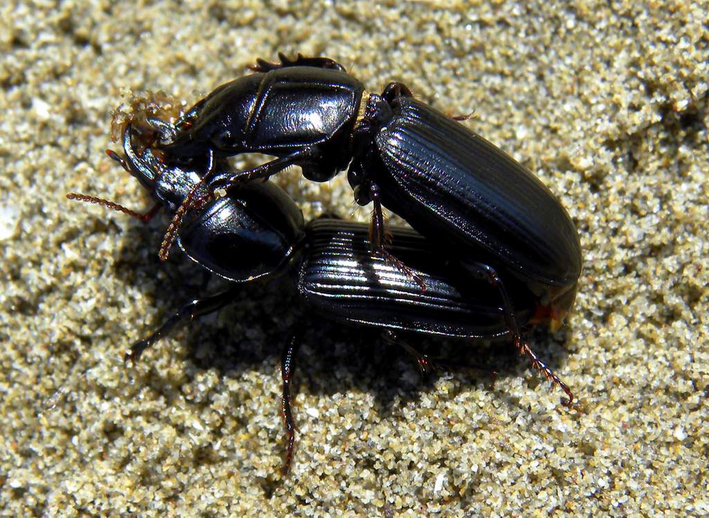 Desidero proporre alcuni atteggiamenti tipici di Parallelomorphus laevigatus (Fabricius, 1792) 01 Normalmente si osserva Parallelomorphus laevigatus in tane superficiali da lui scavate sulla sabbia sotto le alghe e i corpi morti spiaggiati lungo la battigia; 02 ma capita anche di trovarlo sprofondato in tane verticali lunghe alcuni centimetri forse per sfuggire alla calura estiva; 03 la sua dieta è costituita principalmente, sia allo stato larvale che a quello di adulto, da anfipodi ed isopodi; 04 ma non disdegna di nutrirsi anche di altri artropodi; 05 quando si accoppia il maschio si pone sopra la femmina tenendo tra le sue una mandibola della femmina