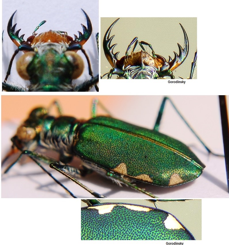 I was just studying this matter: C. funerea assimilis is larger, with more parallel-sided elytra, much less hairy on head and pronotum and has the elytral marginal dots small and separate. C. chloris is smaller, stouter, more hairy on head and pronotum and usually has the elytral marginal dots larger and united. Also the color is different, being brilliant green in C. chloris, bronze or greenish, but always dull, in C. funerea. So both yours and that in Gorodinski's site should be C. chloris, in my opinion. Have a nice evening
