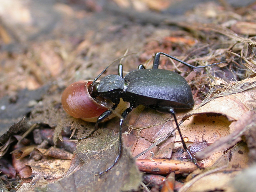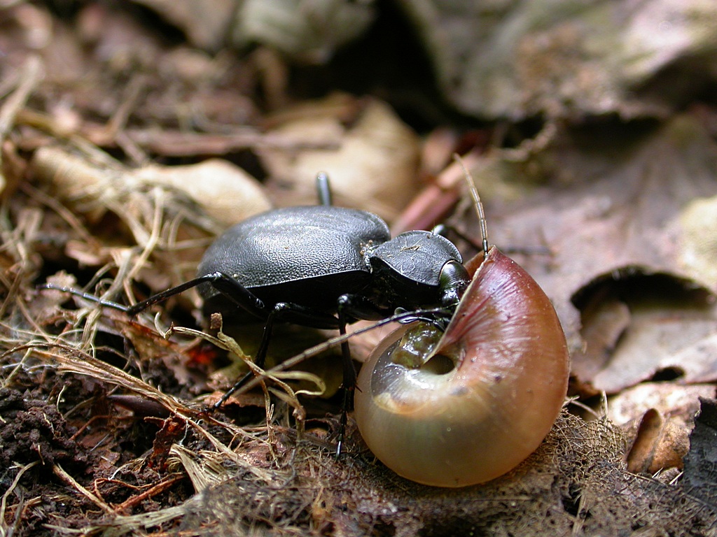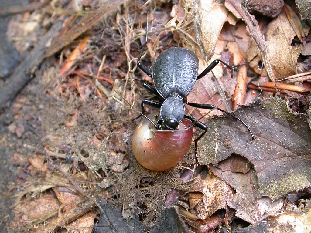 Sotto un grosso bidone di metallo abbandonato, due esemplari di Cychrus italicus, di cui questo intento a succhiarsi la sua chiocciola.