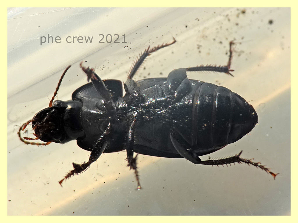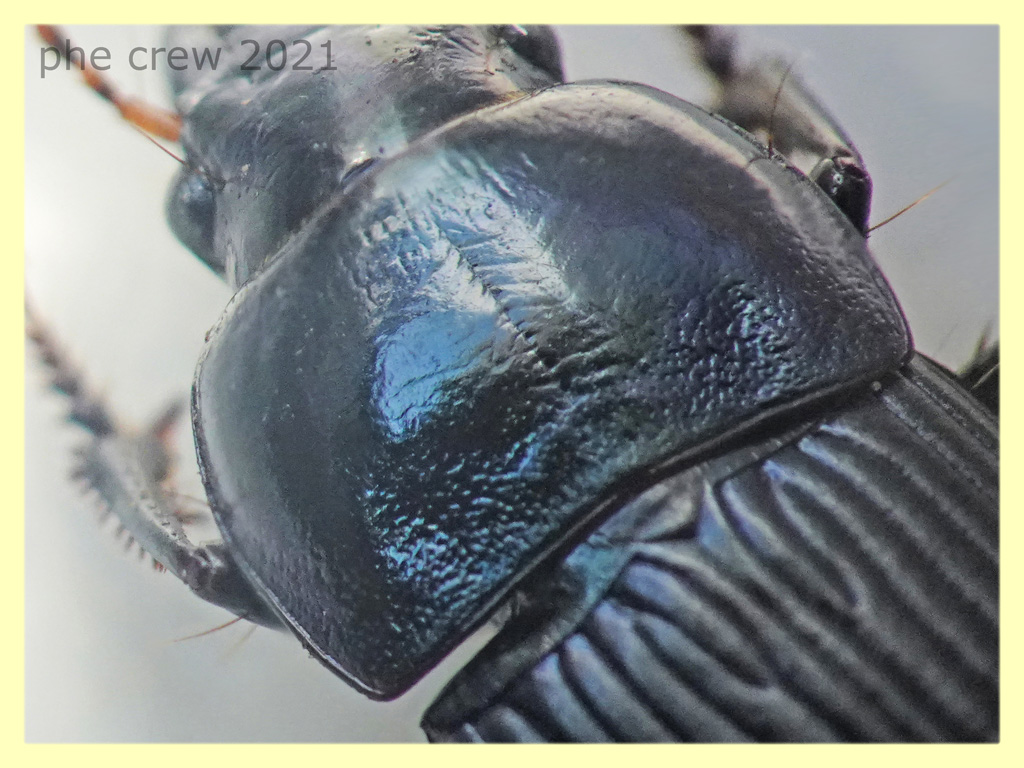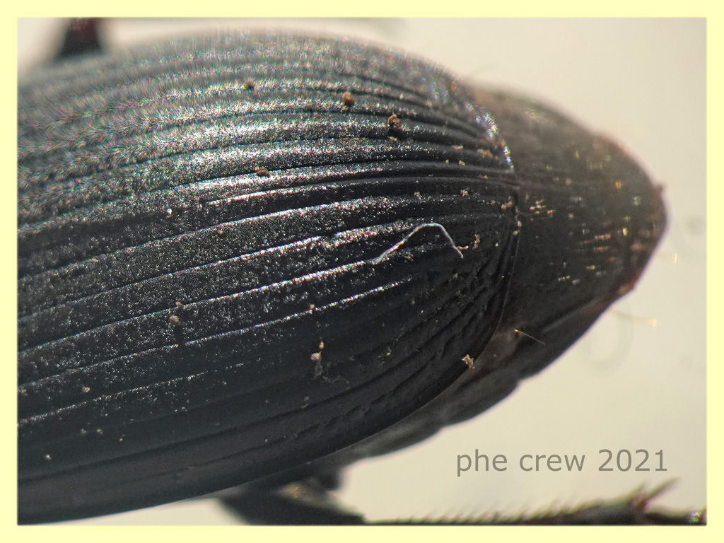 ...in questo caso ho distinto Harpalus dimidiatus dagli altri Harpalus seguendo questi punti: l' interstria 7 ha una serie di punti all' estremità apicale* (quasi in punta all' elitra). corpo di un nero oscuro...il più delle volte con pronoto blu o verdastro scuro metallizzato. Lunghezza dai 10 ai 15 mm. zampe scure raramente rossastre. aggiungo altri dettagli ... c'è un asterisco nella parte in cui si parla dell' interstria 7 che dice: *vedere anche H. tenebrosus var. solieri. Anch' esso sulla 7 e anche sulla 5 interstria presenta qualche punto. Ma in questa specie l' addome è glabro. |