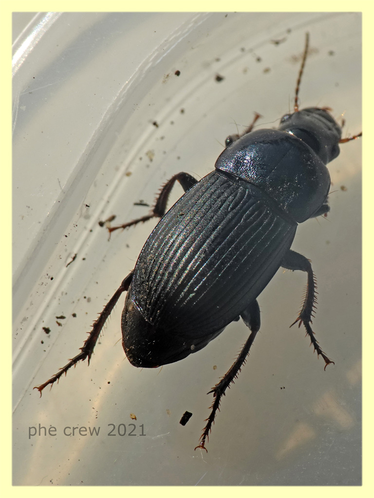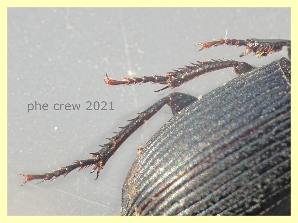 ...dato che mi sono divertito tantissimo a tradurre le chiavi di Jeannel ...vi posto questo comunissimo Carabidae di 12 mm. (compresa la testa) determinato come Harpalus dimidiatus femmina. ![]() p.s. la femmina si riconosce dai tarsi non dilatati. ... intanto possiamo dire che gli Harpalus si possono distinguere facilmente da: costa del pronoto con una setola sulla parte anteriore ed una setola frontale sulla testa. corpo glabro (cioè senza pelosità) tarsi glabri superiormente |