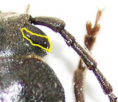 Allora, ho riguardato l'esemplare... Da quello che avevo letto, il syriacus non dovrebbe avere setole fra gli ommatidi, ma al massimo lungo il bordo degli occhi... (ripeto, da quello che ho letto, ma capendone ben poco: sto chiedendo per imparare, non per insistere!  ) Nel mio le setole non sono su tutto l'occhio, ma solo nella parte posteriore, più o meno quella che qui ho evidenziato in giallo; sono comunque piuttosto numerose e poste proprio fra gli ocelli. Questa distribuzione si può considerare "lungo il bordo" e quindi compatibile con syriacus? Grazie
