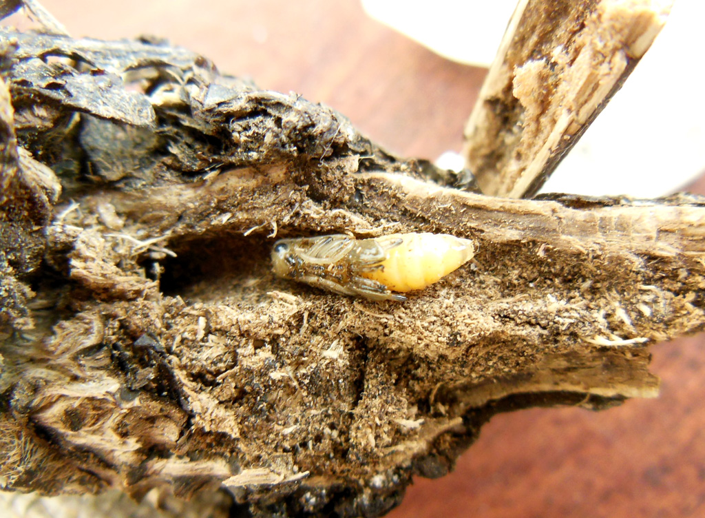Larva nella radice della pianta, a destra la parte del fusto che è fuori dal terreno, a sinistra la radice sotterranea dove prosegue la galleria larvale (12,X,2019)