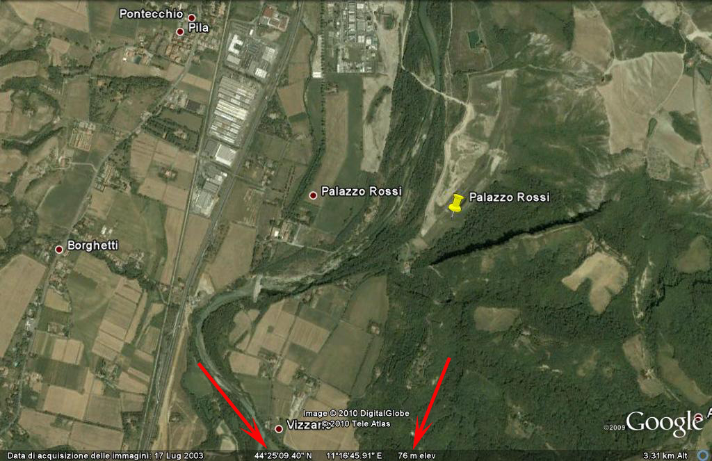 Loriscola ha scritto: Ecco una cosa che volevo chiedervi....c'è una qualche mappa internete dove posso conoscere l'atitudine di un posto preciso ? Sarei curioso di conoscere l'altitudine esatta della mia località.  Come ti ha già detto Marco, se utilizzi Google Earth, basta posizonare il puntatore del mouse sul luogo che ti interessa, e, in basso, vedrai coordinate (settabili in vario modo dalle opzioni del programma) e la quota (anche quella settabile in piedi o metri). Allego qui sotto un'immagine di dove penso sia Palazzo Rossi: con le freccie vedi indicate la quota e le coordinate geografiche (entrambe calcolate in corrispondenza del segnalino giallo).