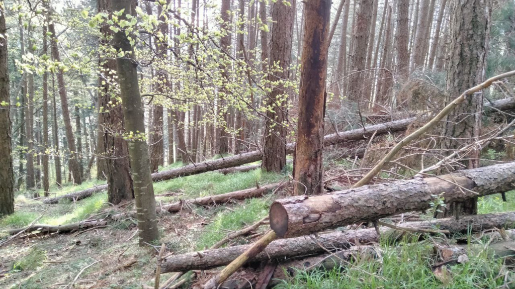 L'albero da cui è stata presa la legna era crollato ma sostenuto dalla vegetazione circostante, pertanto la porzione prelevata non era appoggiata al suolo. L'ambiente è quello mostrato nella foto successiva, un rimboschimento di Pinus (credo P.nigra) probabilmente lasciato a sé stesso da diversi anni, con una buona presenza (per mia somma gioia :D ) di piante schiantate.