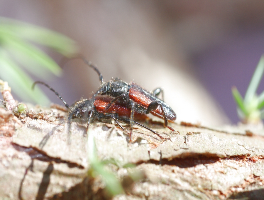 Ora due adulti in copula...la specie è attiva nelle ore piu' calde della giornata. I maschi percorrono la superficie del legno cercando le femmine. La copula può durare molte ore, durante le quali la femmina ovodepone alternando l'accoppiamento a tale fase.