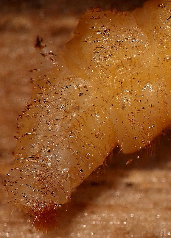 Da notare le spine sugli ultimi segmenti adominali, e i lunghi peli su torace e capo. Suppongo i primi servano per muoversi all’interno della galleria.