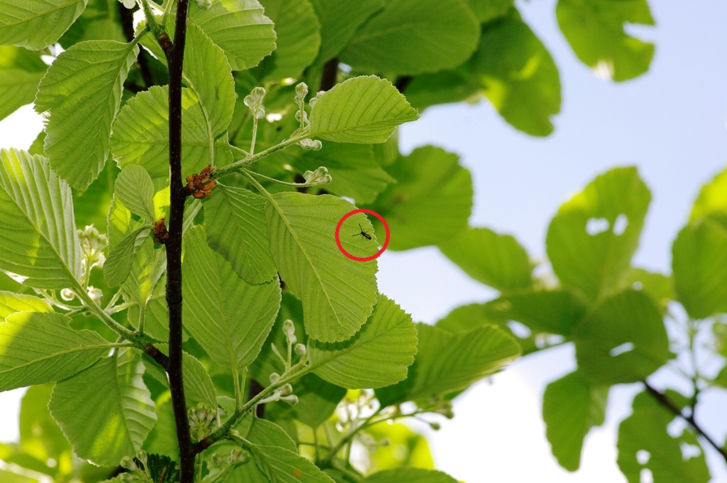 Mentre girellavo ho trovato alcuni sorbi montani per cui, ripensando al ritrovamento di sabato (anche se pensavo fosse stato solo un caso), mi sono messo a scrutare le foglie da sotto. Sui primi 3 o 4 non ho visto assolutamente niente. Su un altro, invece, ho intravisto due Tetrops, ma erano su foglie poste ad altezza tale che non era possibile neanche ombrellare quei rami. :x