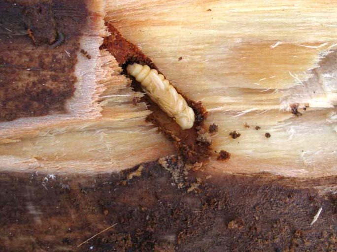 Larva matura (prepupa) messa allo scoperto sollevando la corteccia di Populus sp. morto da tempo