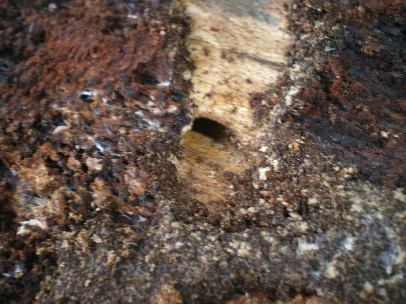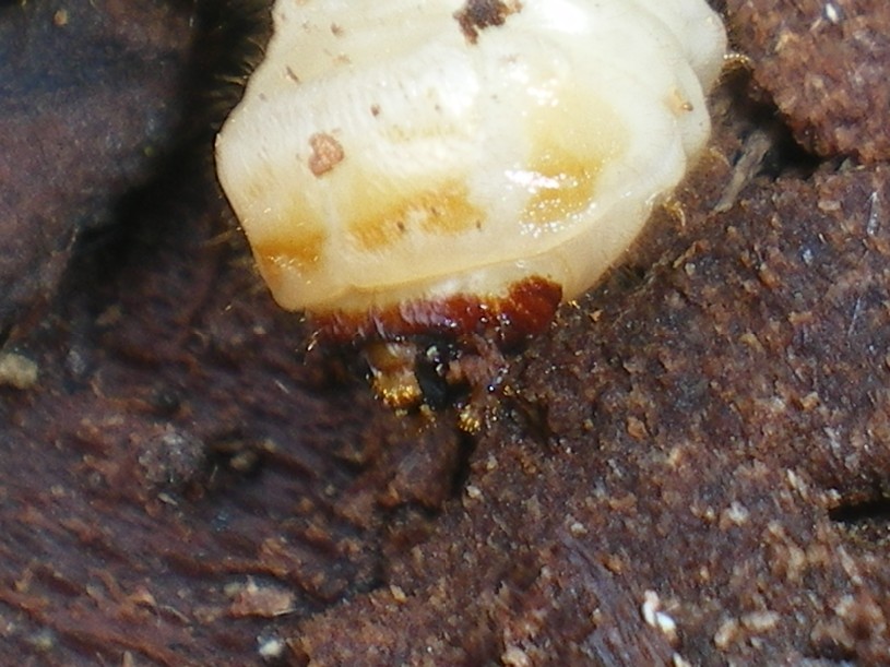 La grossa larva era sotto corteccia, a pochi centimetri da un buco che scendeva nel legno...