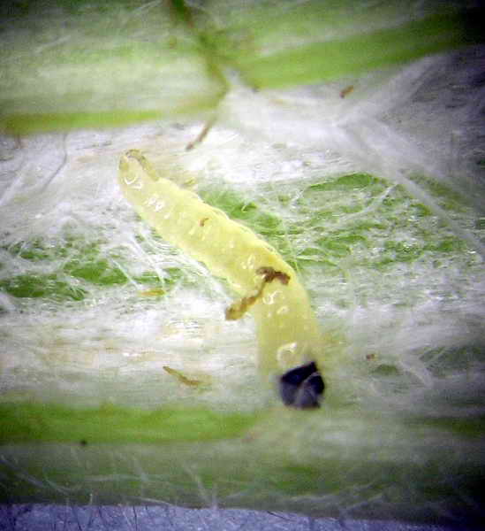 Hoy he abierto un tallo de Cynoglossum y encuentro la primera larvita, que mide 4 mm.