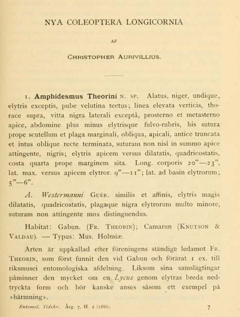 dalla lettura della descrizione originale, sembrerebbe trattarsi di Amphidesmus theorini Aurivillius, 1886, la cui patria tipica è proprio il Gabon.