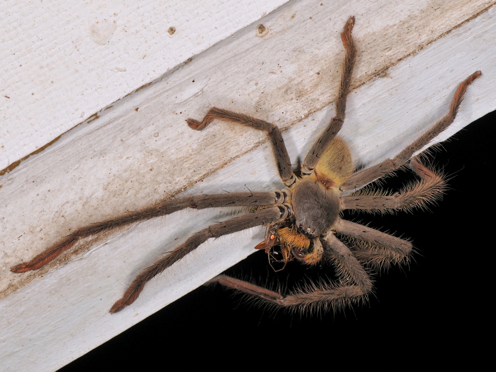 e un altro in bocca ad un "mostro" (maschio di Damastes validus o specie simile, Sparassidae)