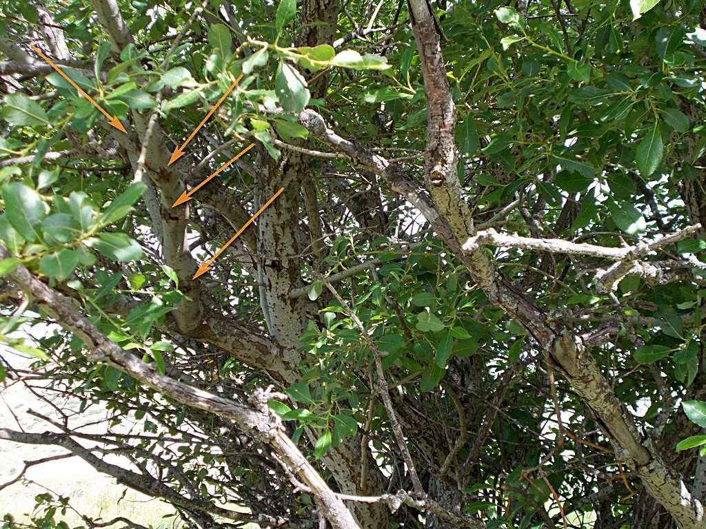 Tornandoci parecchi giorni dopo, sulle stesse piante e su altre della stessa zona non ho trovato più nessun adulto, ma in compenso c'erano numerose incisioni come quella in foto, tutte su rami vivi, tutte longitudinali, qualcuna poco più lunga, altre più brevi. Sono sempre più convinto che le facciano le femmine di Saperda similis e poi ovidepongano lì.