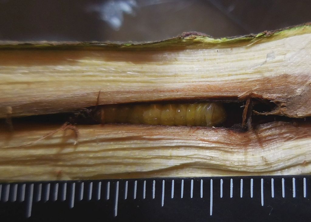Avendo scoperto qualche alberello e stentato cespuglio di Rhamnus frangula, con numerosi segni della presenza di questa specie, in una stretta gola in fondo alla quale scorre un piccolo rio, affluente torrente Enza (nella foto, a sinistra, uno degli alberelli di Frangola), ho tentato l'allevamento asportando 4 rami attaccati a settembre 2017 e cercando di farli radicare in sabbia umida, senza riuscirvi. Tre giovani larve non sono sopravvissute, solo una larva, più grossa delle altre (quindi immagino al secondo anno di vita) ha portato a termine il ciclo nel giugno 2018, ma sfarfallando molto deformata e di piccole dimensioni, a causa del legno ormai secco da tempo. Metto le foto delle larve di questo tentativo di allevamento, la foto al povero Quasimodo ve la risparmio :(