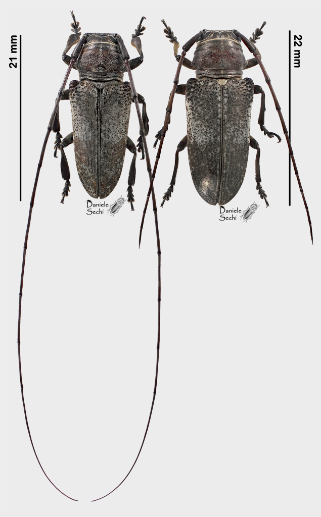 Prosopocera (Parapocera) fatidica (Pascoe, 1868), unica coppia raccolta. Alla luce. Il maschio ha delle curiose tibie allargate e appiattite nei due terzi apicali. |