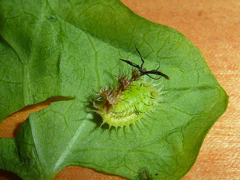 Lo scorso luglio ho raccolto in una aiuola nel campus dell'Università di Haremaya in Etiopia alcune larve di Cassida, lunghe poco più di 1 mm. Tornato in Italia, ho allevato tre esemplari nutrendoli con foglie di convolvulacee spontanee. Il 2 agosto, raggiunte le dimensioni di poco meno di 10 mm, le larve si sono impupate (immagine 1) e sono sfarfallate il 7. Gli adulti hanno le elitre giallastre trasparenti con una specie di croce di Sant'Andrea, inizialmente bronzea (immagini 2 e 3), che dopo qualche giorno è diventata dorata (immagini 9 e 10).