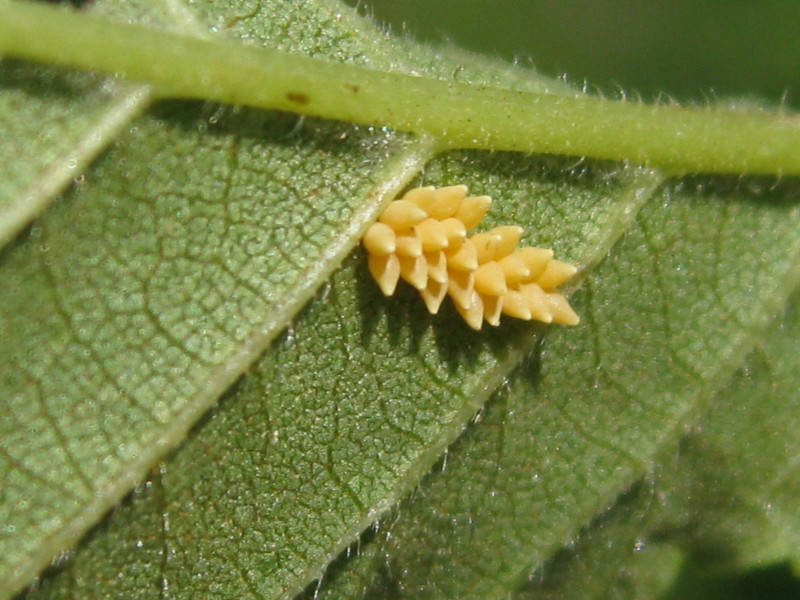Su foglie di Ulmus sp, un adulto e le uova di Xanthogaleruca luteola - Chrysomelidae.