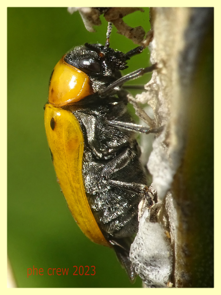 ...questo e' un altro esemplare ma della stessa specie con punti piu' piccoli, che si e' fatto fotografare su una foglia di Fico D' India.