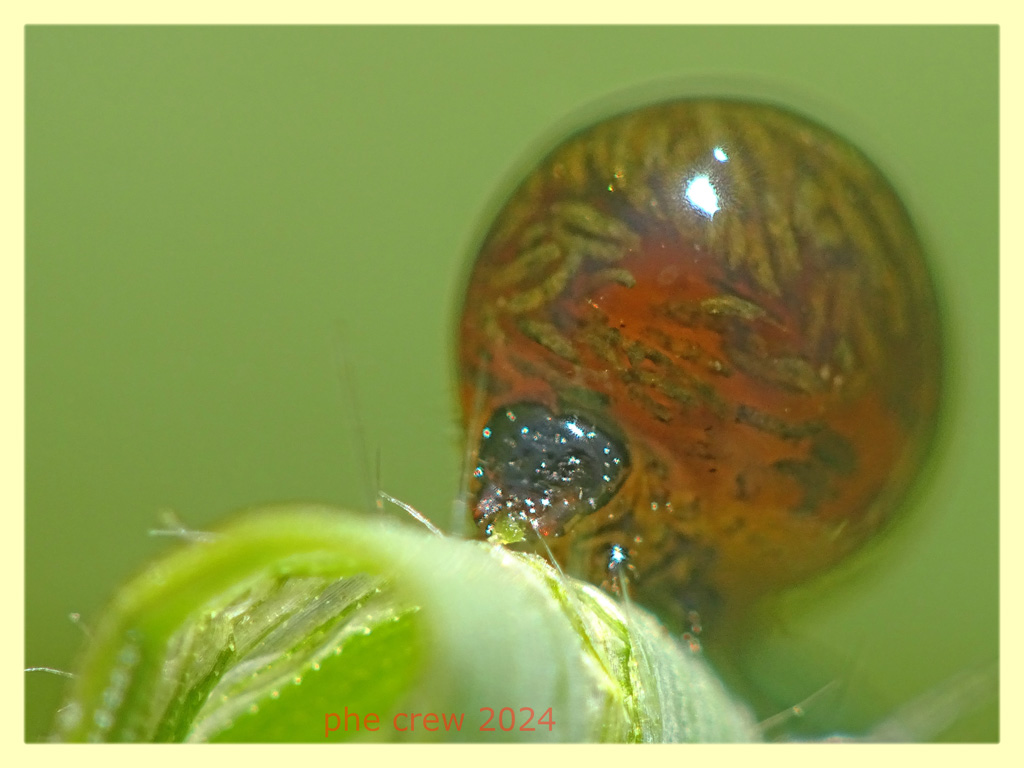 ...dopo tanti anni che le vedo in ogni dove sono finalmente riuscito a determinare queste Oulema sp., precisamente si tratta della specie Oulema duftschmidi. Gli esemplari raccolti misurano dai 4 ai 4,5 mm. ...questo e' l' edeago e il flagello (accostati non in proporzione) e un antenna... ...questa e' la larva che si trova proprio in questo periodo insieme agli adulti anche in accoppiamento. Mangia dei comunissimi fili d' erba. In una foto la faccia sembra rosa, ma e' solo il riflesso della mia mano sinistra, in un' altra si vede addirittura che strappa un pezzo del filo d' erba con le mandibole. |