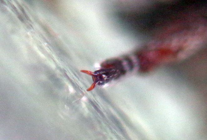 Foto richiesta (80x ma un po' rimpicciolita per renderla simile a quella sopra) delle unghie secondo paio lato destro (perchè quelle a sinistra del topic sopra sono troppo appiattite al cartellino e la visione diretta è complicata. Non si vedono apprezzabili denticoli ma c'è un problema; visto che altre chiavi non citano i particolari delle unghie, ho messo l'esemplare al microscopio ottico (50x, non posso fare foto) e alle unghie anteriori e posteriori si apprezza un piccolissimo denticolo prebasale molto acuto, praticamente invisibile o quasi alle unghie medie. Mi chiedo quanto sia affidabile il carattere: certo nei miei tessellatus il dente è molto più evidente e meno acuto nei tre tarsi e la forma generale e colore dei tegumenti è diversa; inoltre, gli omeri mi pare di vedere siano più o meno arrotondati secondo il sesso (più tondi nei maschi). In sintesi, a mio modesto parere, credo che colore e, almeno nelle femmine, la forma di torace ed elitre siano più affidabili per le due specie.