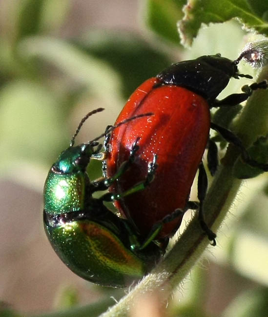 Ciao, sono Chrysomelidae, infatti, gen. Chrysolina. La foto in cui entrambi sono rossi, che non hai inviato, è la foto di due individui di normali tendenze, mentre le due foto che hai inviato raffigurano esemplari di specie diverse che tentano di accoppiarsi! |