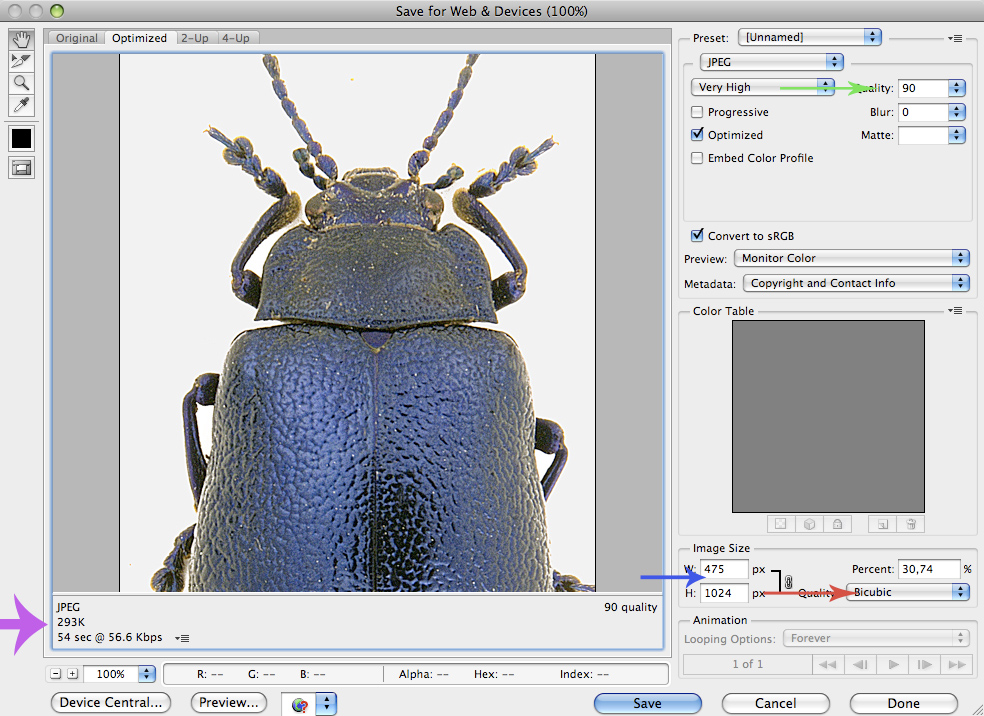 Con immagini di lato fino a 1024 pixel, in formato jpg si può rientrare facilmente nei 400 kb dettati dal Forum con fattori di compressione intorno al 90%, ma se si tratta di immagini con molto sfondo uniforme, o comunque con pochi dettagli, si può a volte arrivare anche al 100% o quasi, mentre con immagini più complesse (ad esempio foto in natura molto nitide con sfondo molto vario, o insetti preparati ma con foto particolarmente dettagliate), bisogna aumentare un po' la compressione, portandola intorno a 85%, che comunque degrada l'immagine in modo ancora molto poco percettibile. Alcuni programmi di fotoritocco hanno modi diversi per indicare la compressione dei file jpg, ma se fai qualche prova, o sono dotati di antemprima del risultato, basta regolarsi in modo di avere la minima compressione che permetta di restare sotto i 400 kb. La maggior parte delle mie foto di esemplari preparati, compresse con fattore 90%, stanno sui 200-250 kb, quindi abbondantemente sotto il limite.