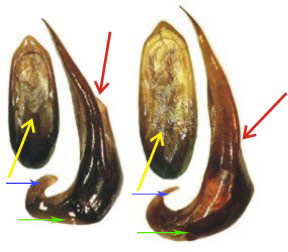 Quello che mi ha fatto pensare alla laticollis sono gli spessori dei "rostrini" (freccia blu), che mi sembrano molto piu da laticollis, e dalla base (freccia verde), che mi sembra piu piatta e "spigolosa" nella curva in laticollis... Però credo che siano molto piu importanti per discriminare i caratteri "alti" che quelli della base...(ho usato la tua foto mod cosi restano segnati gli altri caratteri)