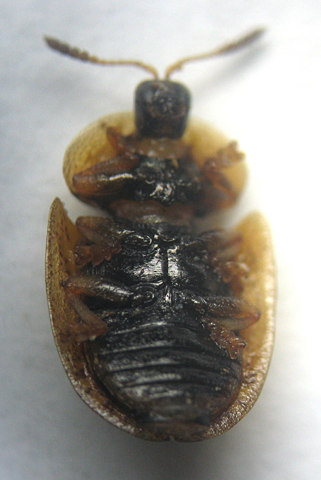 Hypocassida subferruginea (Schrank, 1776). Il colore dell'addome non dovrebbe lasciare dubbi rispetto alla molto simile H. cornea.