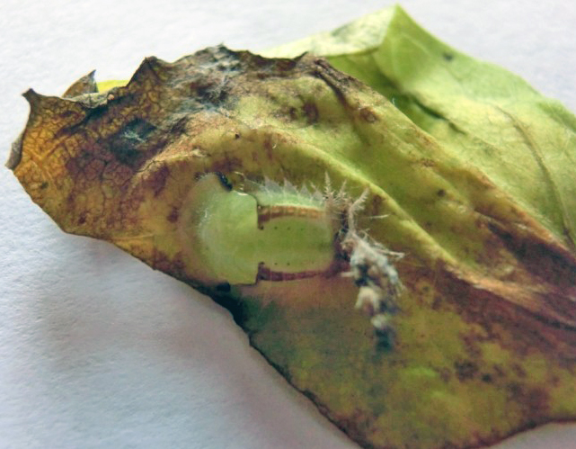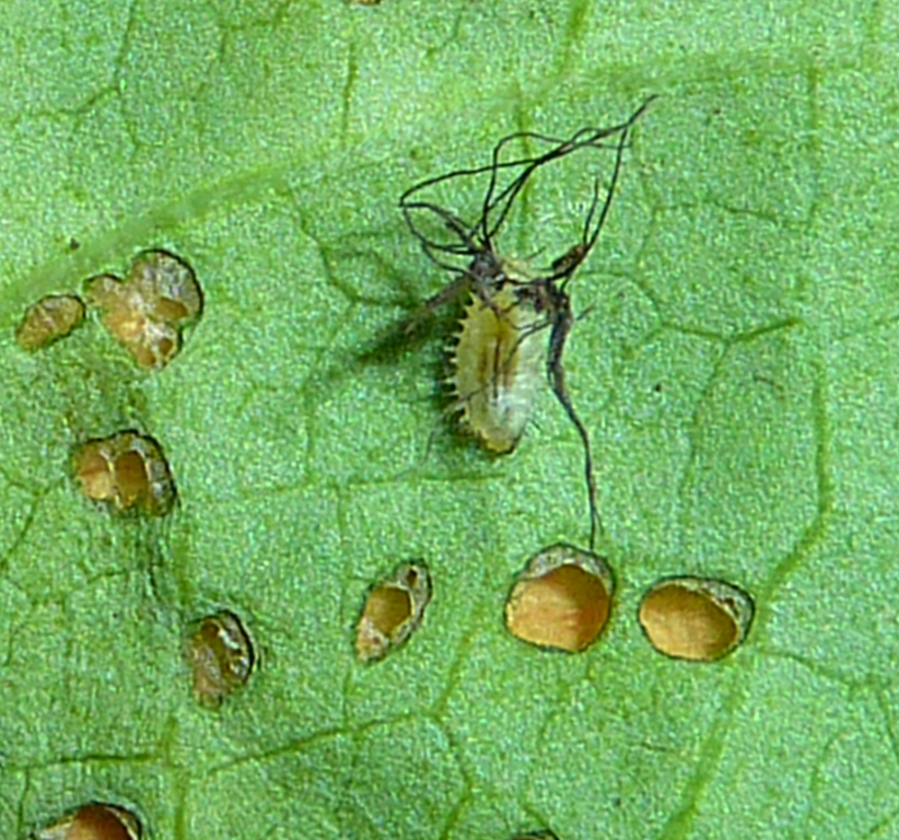 Il 27 agosto ho notato il primo accoppiamento e trovato alcune ooteche (immagine 4), di forma inusuale rispetto a quelle delle specie italiane che conosco, e il 4 settembre ho trovato le prime larve (circa 20), lunghe circa 0.5 mm, di colore verde molto chiaro che in pochi giorni sono cresciute di vari mm e che invece dell'usuale scutello mostravano alle terga una sorta di "festoni" di escrementi (immagini 5 e 6). Successivamente ai "festoni" si sono aggiunte le spoglie delle mute precedenti (immagini 7 e 8). Tra il 20 e il 21 settembre le larve si sono tutte impupate e sono sfarfallate tra il 27 e il 28. Il 3 ottobre ho osservato il primo accoppiamento della "seconda generazione".