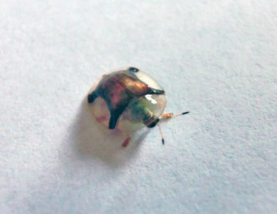 Lo scorso luglio ho raccolto in una aiuola nel campus dell'Università di Haremaya in Etiopia alcune larve di Cassida, lunghe poco più di 1 mm. Tornato in Italia, ho allevato tre esemplari nutrendoli con foglie di convolvulacee spontanee. Il 2 agosto, raggiunte le dimensioni di poco meno di 10 mm, le larve si sono impupate (immagine 1) e sono sfarfallate il 7. Gli adulti hanno le elitre giallastre trasparenti con una specie di croce di Sant'Andrea, inizialmente bronzea (immagini 2 e 3), che dopo qualche giorno è diventata dorata (immagini 9 e 10).