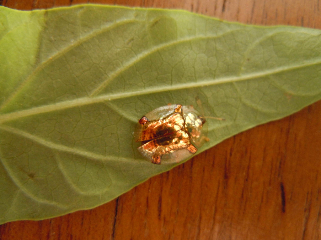 Lo scorso luglio ho raccolto in una aiuola nel campus dell'Università di Haremaya in Etiopia alcune larve di Cassida, lunghe poco più di 1 mm. Tornato in Italia, ho allevato tre esemplari nutrendoli con foglie di convolvulacee spontanee. Il 2 agosto, raggiunte le dimensioni di poco meno di 10 mm, le larve si sono impupate (immagine 1) e sono sfarfallate il 7. Gli adulti hanno le elitre giallastre trasparenti con una specie di croce di Sant'Andrea, inizialmente bronzea (immagini 2 e 3), che dopo qualche giorno è diventata dorata (immagini 9 e 10).