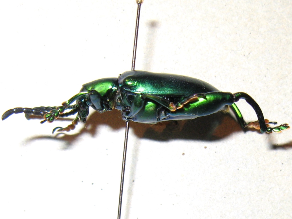 Iniziamo con i Chrysomelidae Questo lo comprai diversi anni fa per dare un tocco di colore e incremento di dimensioni ai miei pochi Crisomelidi di un tempo. Un giorno la ripreparerò. E' determinata come Sagra femorata. E' lei? Si capisce se è maschio o femmina, propenderei per femmina. Avrei fatto altre foto ma mi si è scaricata la fotocamera. L. = 19 mm |