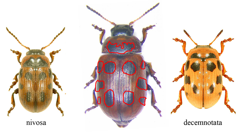 E se fosse invece Gonioctena nivosa (Suffrian, 1851)? Ho evidenziato in rosso le macule di pronoto e elitre dell'esemplare di Augusto, e incollato accanto le immagini prese dal solito, insostituibile, sito di Lech Borowiec.
