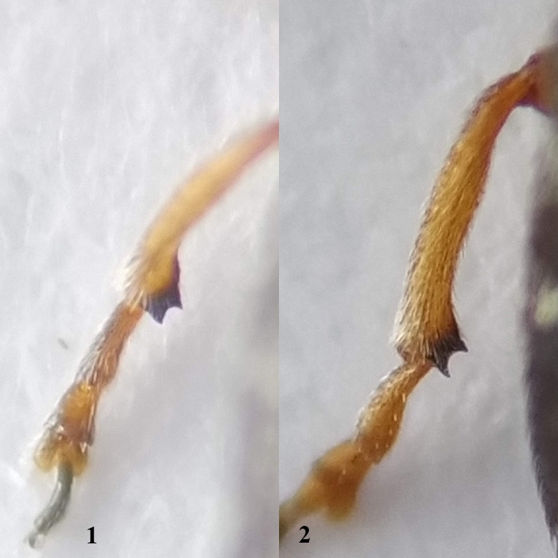 Hi all , I am not sure about these 2 specimens of Bruchus . Number 1 I think it is B. luteicornis but I am not sure about the number 2, it is also luteicornis (but the eight ventrite is different and I think also the spine on the mid tibia) or it is B. rufipes? Both specimens were collected in the same place in the same day.Thanks for your help ,Alex ![]() |