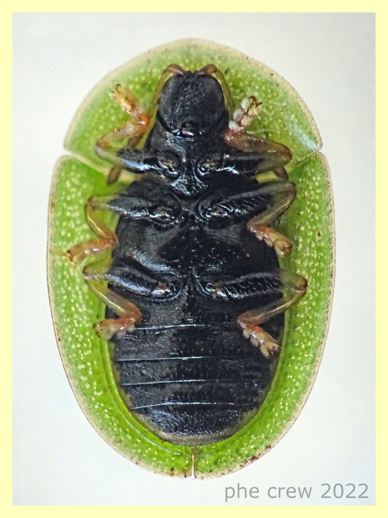 ...un Cassidinae di 5 mm., non sono riuscito a capire a che specie appartiene….la ribordura chiara e' del pronoto ed elitre o e' formata dalla forma del corpo che si vede in trasparenza ? ...se e' cosi' sarebbe tutta di un verde chiaro… |