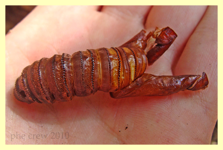 Io ho trovato diverse volte crisalidi dentro agli alberi e molte volte exuvie come quella illustrata, che sporgono a metà dal tronco.