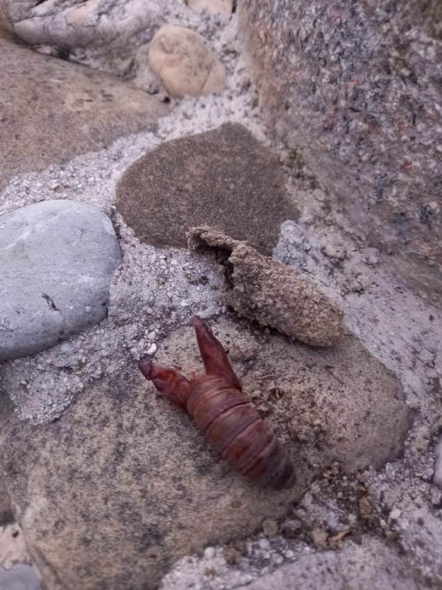 Bisognerebbe poter esaminare meglio l'esuvia, e anche avere un'indicazione delle dimensioni. Se queste sono piuttosto ragguardevoli, è facile ipotizzare che si tratti di bozzolo e di esuvia di Cossus cossus.