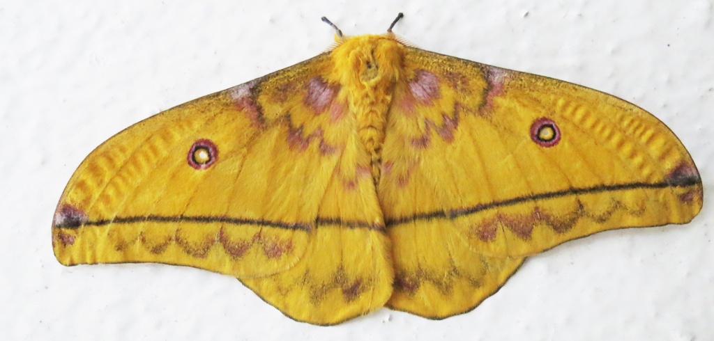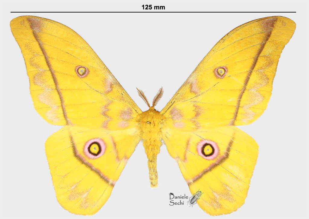 Lo status di Gonimbrasia dione (Fabricius, 1793) non mi è molto chiaro, nel senso che non so quale sia l'attuale nome disponibile per questa specie. Comunque inserisco anche questo bel saturnide giallo limone screziato di rosa.