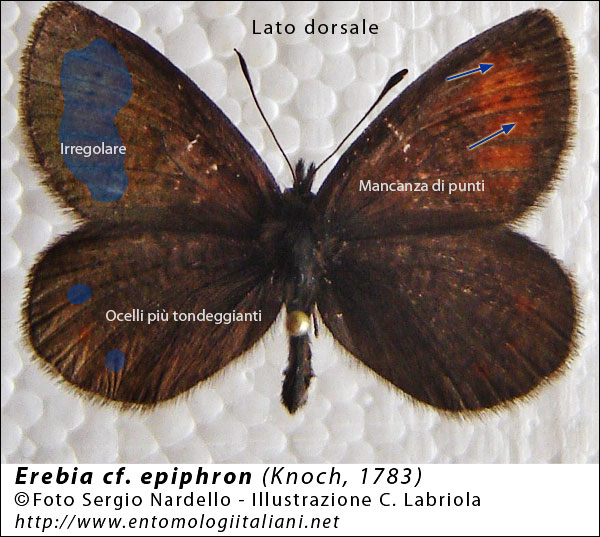 Ho preparato una serie di immagini utilizzando le foto di Sergio e di Corrado dove ho evidenziato i caratteri che secondo me, e sottolineo “secondo me”, fanno attribuire l’esemplare ritratto da Sergio ad Erebia epiphron.