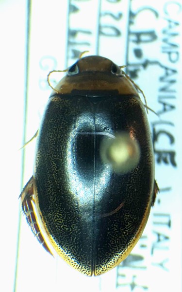 Ho raccolto dei Rhantus suturalis, tipici, di recente utilizzando la tecnica del telo nero riflettente. L'ho posizionato nei pressi di un rigagnolo di scolo di un fontanile (area infestata di gambusie) a circa 200 m in linea d'aria dal fiume Volturno, 110 m sml. Assieme a loro ho recuperato due femmine, con identiche caratteristiche, del tipo che vengo a sottoporvi. Non ho assolutamente esperienza, l'occhio però mi suggerisce trattarsi di un'altra specie e non di una aberrazione cromatica del comune suturalis. Entrambi gli esemplari appaiono più ovoidali, i tegumenti superiori più lucenti, quelli inferiori uniformemente testacei, non neri. Manca la macchia romboidale al centro del pronoto ma è presente, in ambo i casi, una lunga macchia transversa che corre parallela al margine pronotale inferiore; esclusivamente quella. Misurano 11 mm.