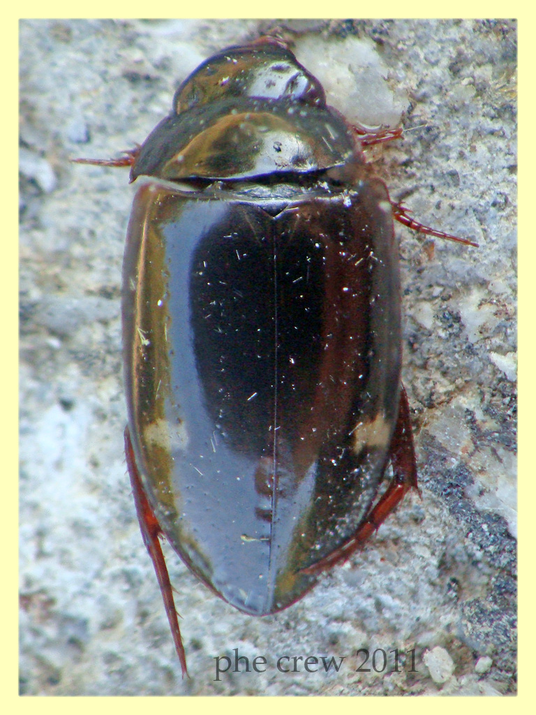 Come dice il buon Leonardo è veramente cosa ardua da fotografia. Ho dovuto scartare alcune ipotesi e direi A. binotatus: coinciderebbe con le grandi macchie sulle elitre che - in foto - possono far pensare anche ad A. didymus, ma i tarsi sono troppo slanciati per quest'ultima specie e poi, nonostante nella foto non sia chiaro, mi pare di vedere che i punti del bordo anteriore del pronoto si interrompono nel mezzo, carattere da Agabus del gruppo biguttatus. L'unica cosa che mi lascia un po' dubbioso è il fatto che l'insetto appare completamente nero, mentre A. binotatus possiede le elitre castano scure, ma questo potrebbe essere un effetto dell'illuminazione.