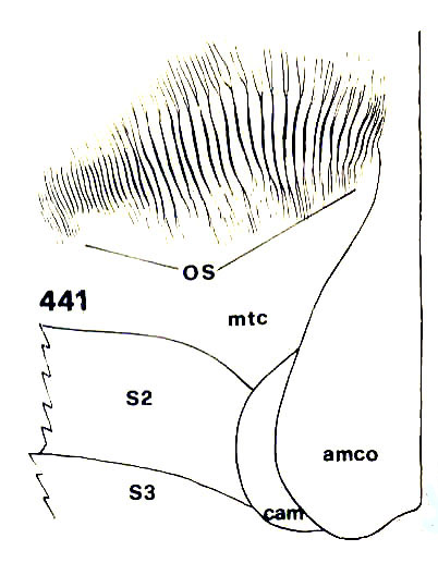 mtc è la piastra metacoxale, amco è l'apofisi metacoxale, cam è la cavità articolare della metacoxa e s2-s3 sono, ovviamente, il II e III sternite addominale.