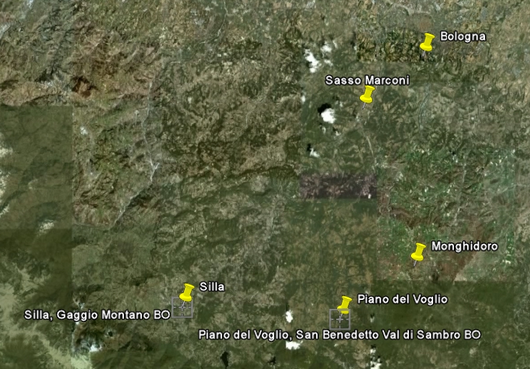 Qui appresso un'immagine satellitare in cui è evidenziata la località del tuo esemplare (Sasso Marconi) e le tre stazioni più vicine alla tua, note in letteratura: Silla, Monghidoro, Piano del Voglio (fonte CKmap)