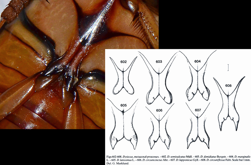 Il 31 luglio ho trovato diversi Dytiscus (almeno 4-5 esemplari adulti) in un abbeveratoio per animali a circa 1000 m s.l.m., al margine di un bosco misto di pino, faggio e abete. Quel giorno non sapevo dell'importanza delle apofisi metacoxali e non le avevo fotografate, perciò l'altro ieri sono ritornato sul posto e ne ho preso uno per provare a dargli un nome. Mi sono documentato un po' prima di aprire il topic e, prendendo come riferimento uno schema trovato sul forum, penso possa essere D. marginalis, ma ho ancora dei dubbi perciò meglio chiedere.