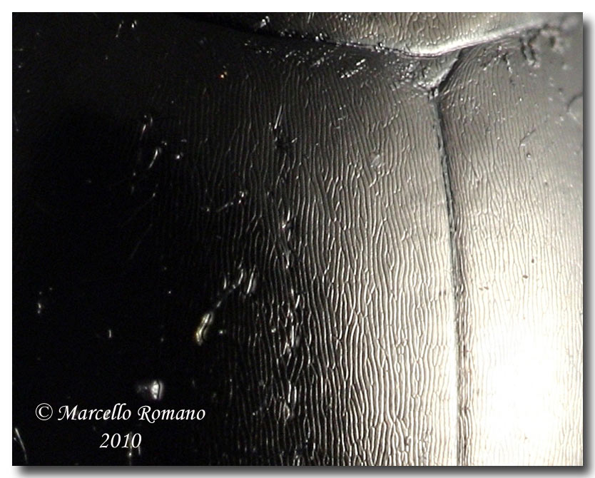 La microreticolazione delle elitre, come dicevo, è un carattere discriminante: le maglie sono assai più grandi dei punti delle serie primarie e sono molto allungate longitudinalmente, specialmente nella metà anteriore delle elitre, come si vede in questo ingrandimento fatto ad un esemplare siciliano della mia raccolta.