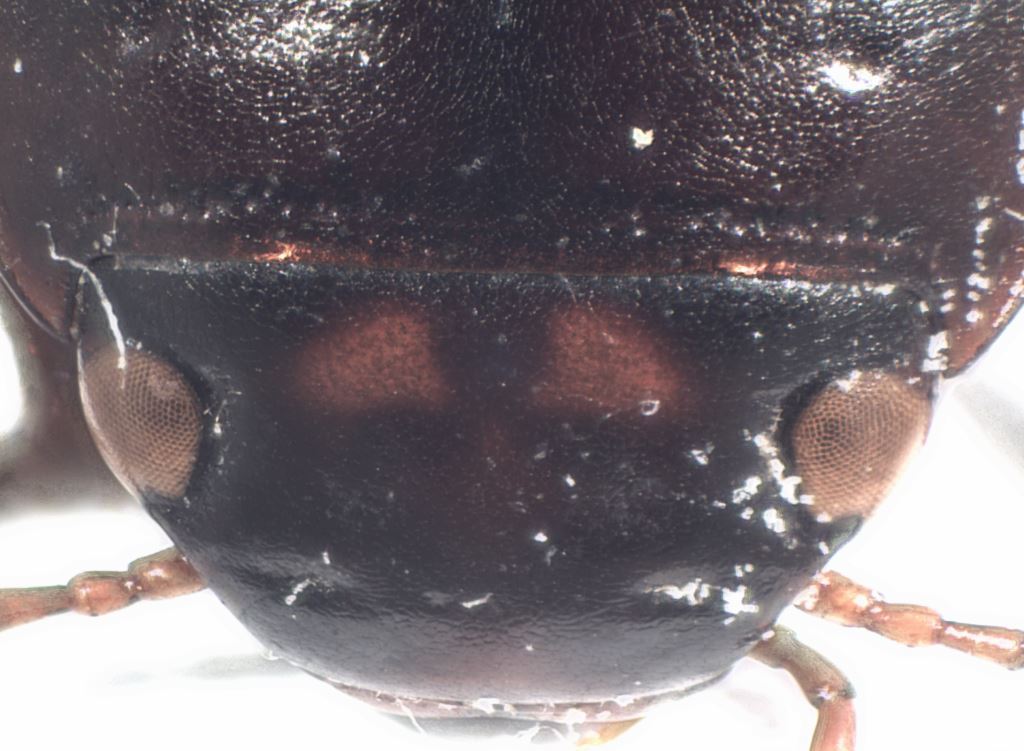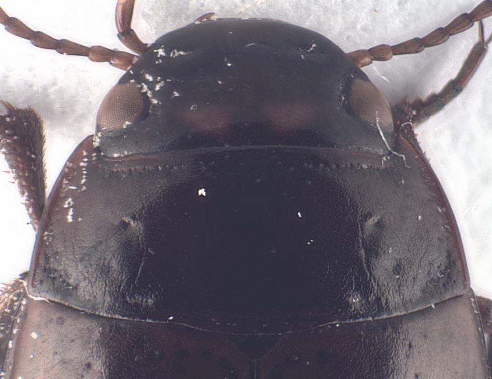 Al passo successivo verifichiamo che la fila di pori anteriore sul pronoto è ampiamente interrotta al centro e che nel reticolo elitrale non vi sono pori alle intersezioni delle maglie (suppongo che tu lo abbia osservato al binoculare); successivamente osserviamo che i palpi sono ferruginei e l'unghia esterna dei tarsi anteriori è inerme, non dentata.